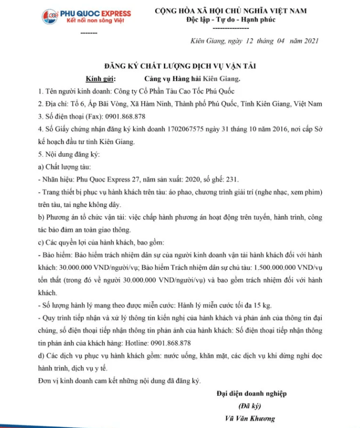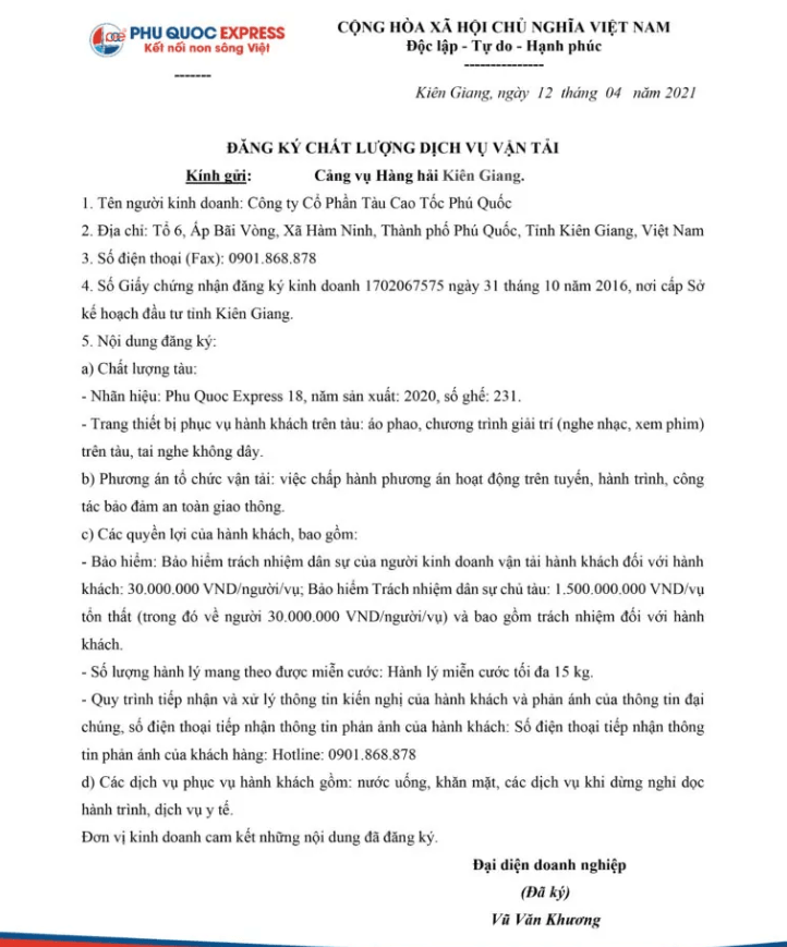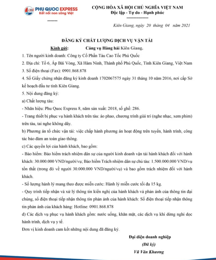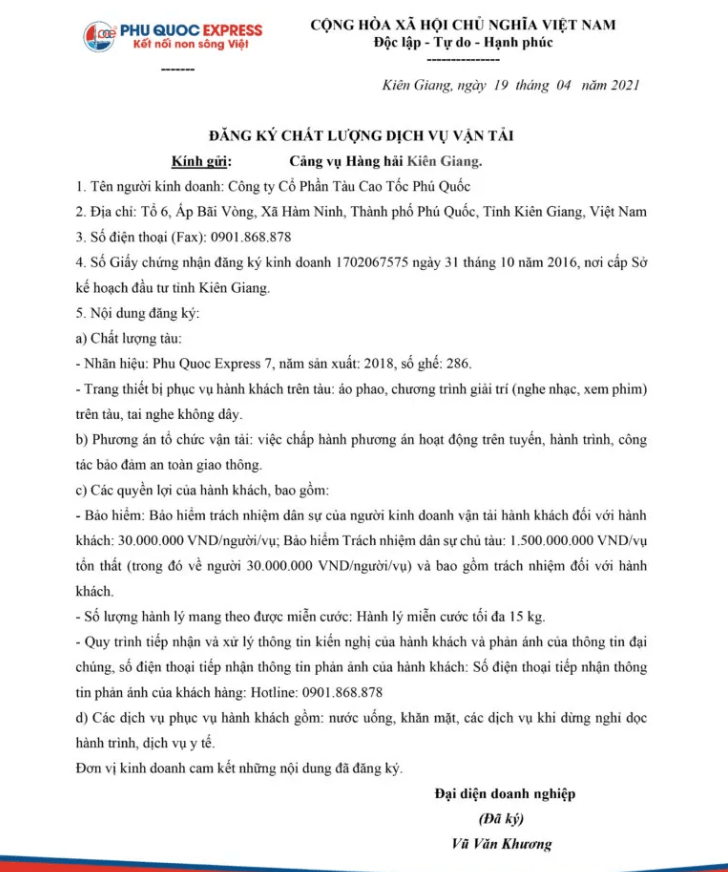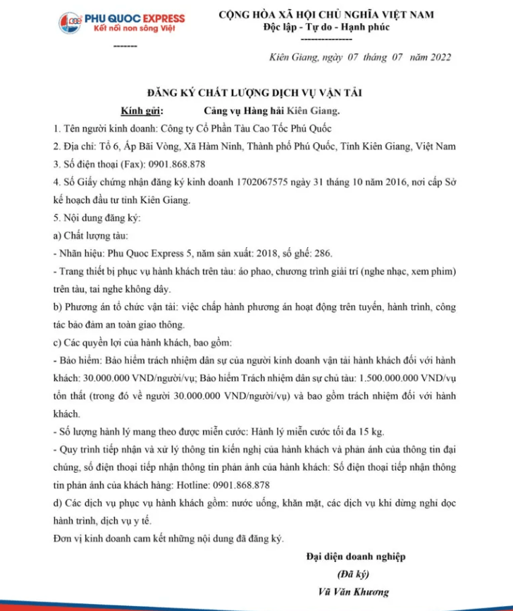 Dưới đây là thông tin đăng ký chất lượng dịch vụ tàu Phú Quốc Express (đội tàu Đỏ):